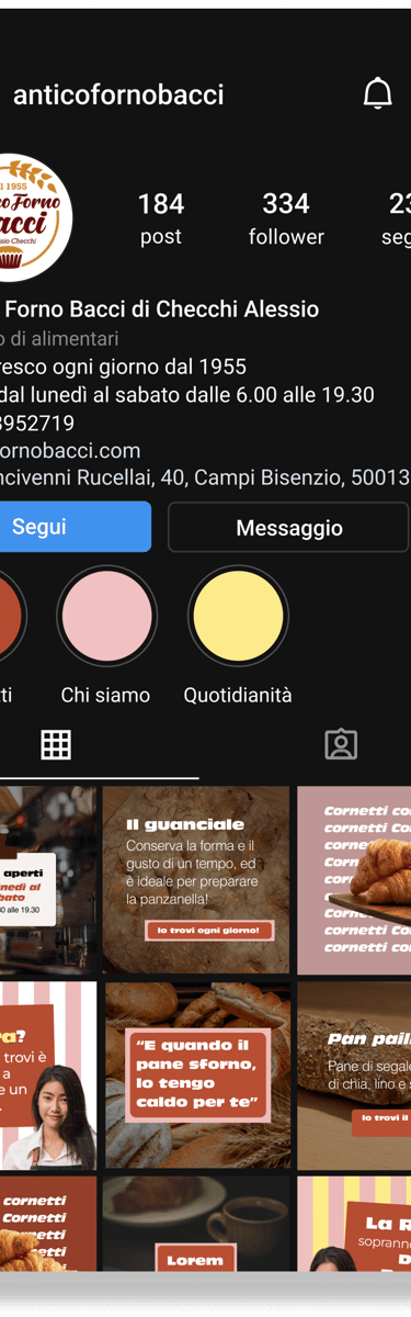 Per l’Antico Forno Bacci ho realizzato un sito che racconta la storia del panificio: dalle sue origini fino alla gestione di Alessio, che ha saputo mantenere vivo il legame con la tradizione senza rinunciare a un approccio moderno alla panificazione.
