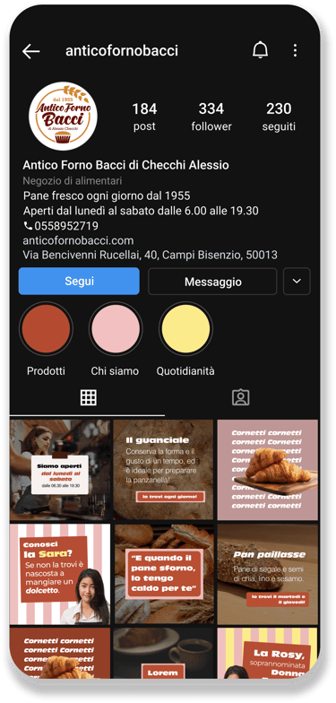 Per l’Antico Forno Bacci, un panificio radicato nella tradizione, ho curato il tono di voce ispirandomi a due archetipi chiave: